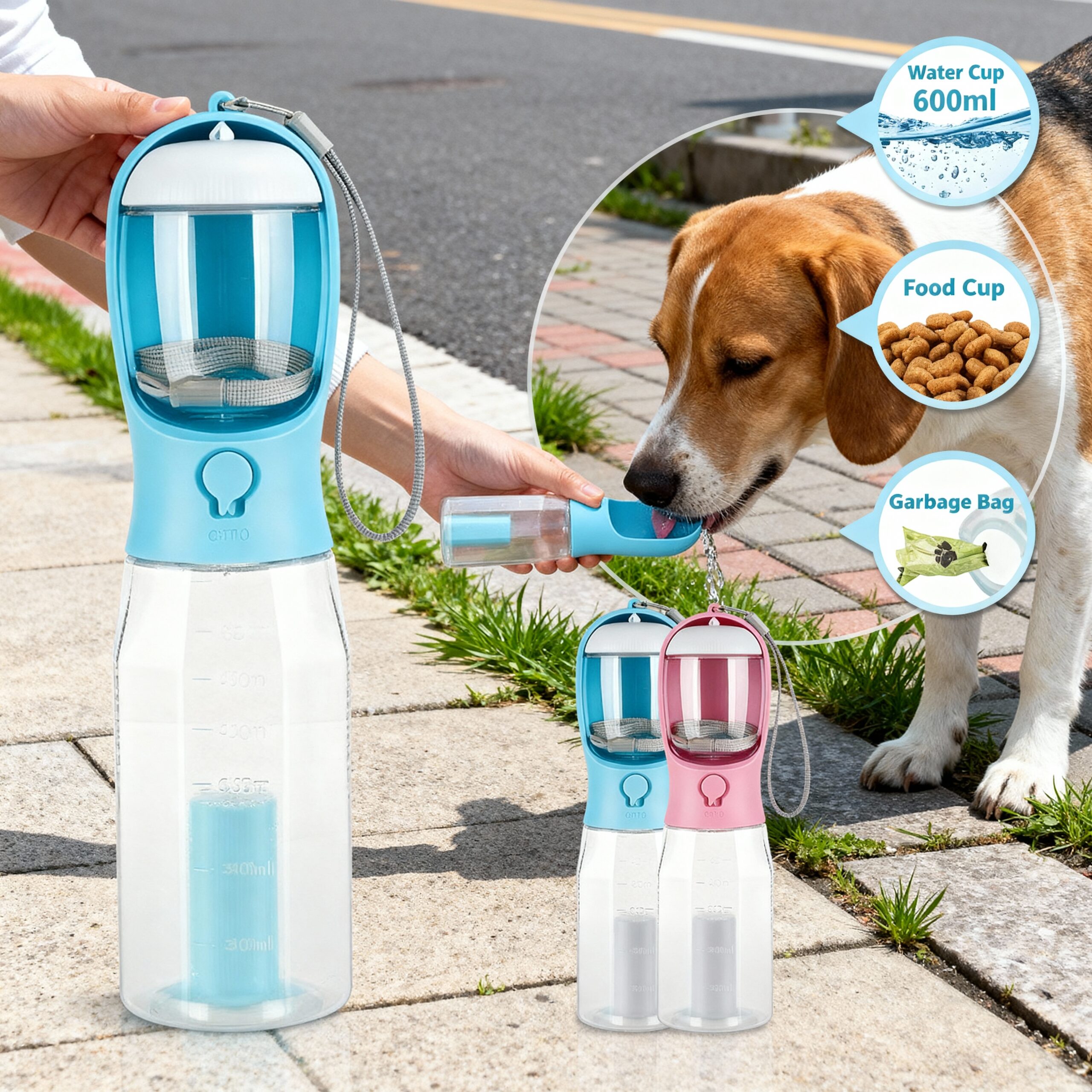 • All-in-One Design: Combines a 600ml water dispenser, food feeder, and built-in poop bag dispenser in one sleek, portable bottle.